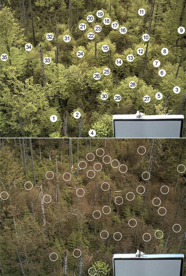 Reaktion von Rotbuchen im Bayerischen Wald auf ein Spätfrostereignis. Die obere Abbildung zeigt den Zustand am 3. Mai 2011 vor dem Spätfrost, die untere Abbildung den Zustand am 4. Mai 2011 nach dem Spätfrost. Die Punkte kennzeichnen Bildregionen anhand derer die Erholungsdauer bis zur Wiederbelaubung berechnet wurde.(Bildquelle: Menzel A., Helm R. & Zang C. (2015). Functional Plant Ecology, 6, 110.)