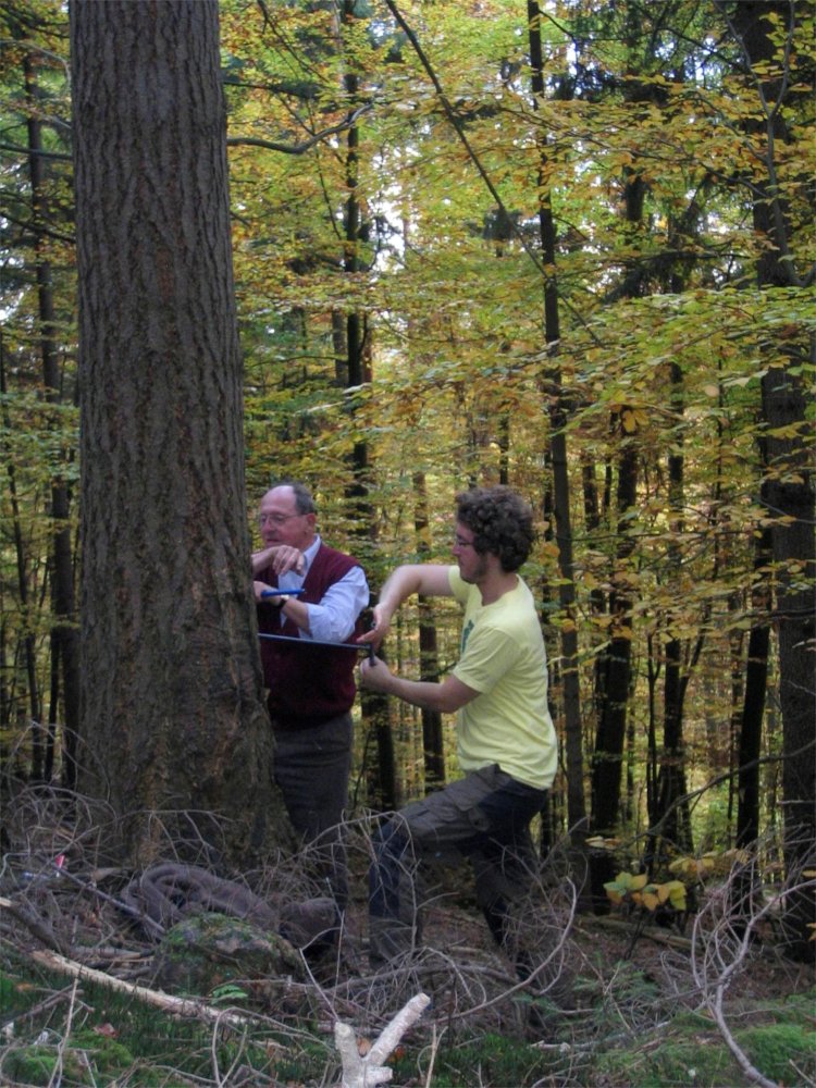 Entnahme von Bohrkernen in der bayerischen Rhön. Zuwachszeitreihen aus Jahrringmessungen sind eine wertvolle Datenquelle für HyBBEx, da Bäume in ihren Ringbreiten Informationen über ihre Erholung von Klimaextremen speichern. (Bildquelle: C. Zang privat)