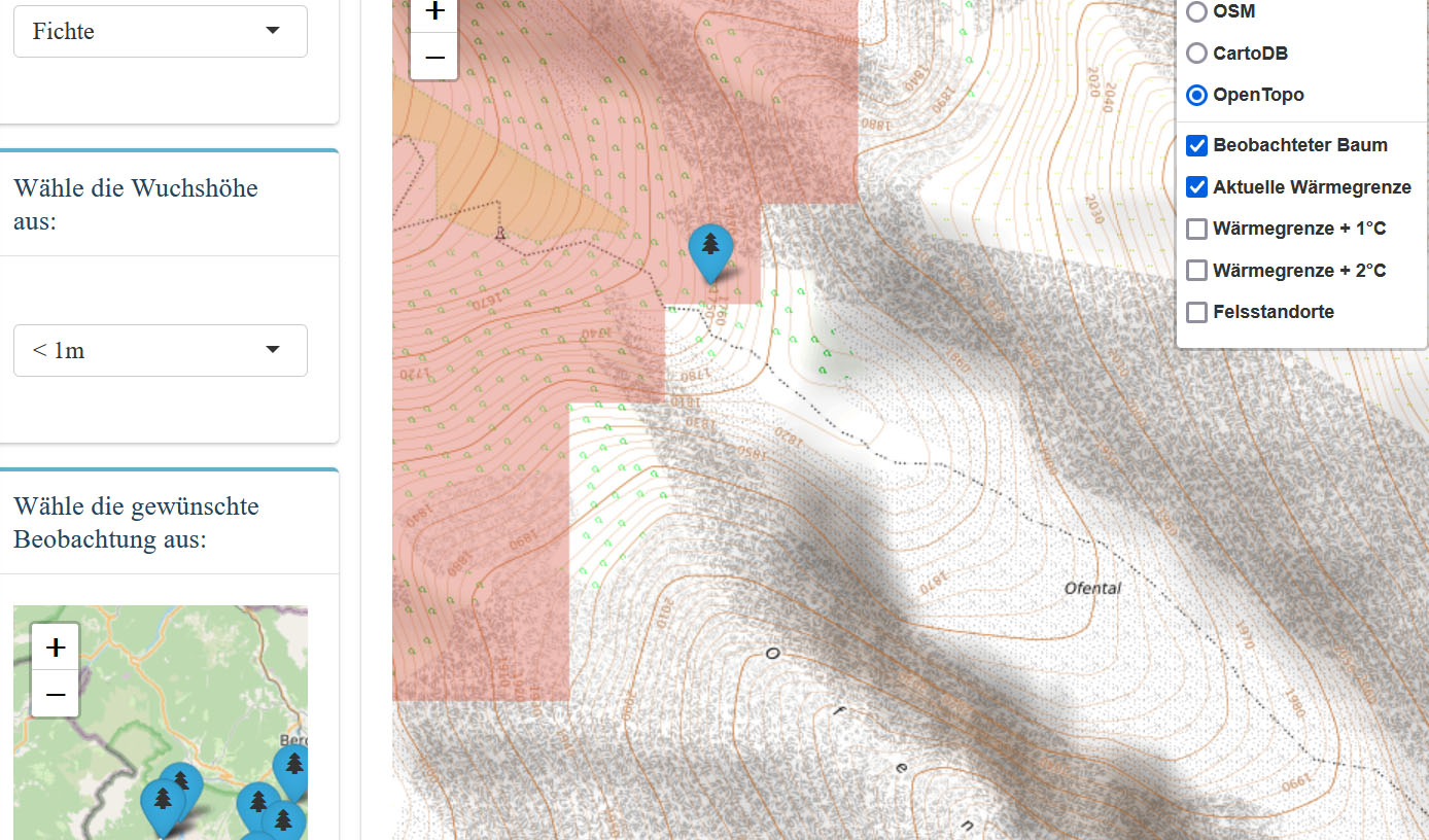 Brand new in the research project BAYSICS: With the analysis tool “TreelinePredict”, the thermal limits of tree species in the Bavarian Alps can be simulated.