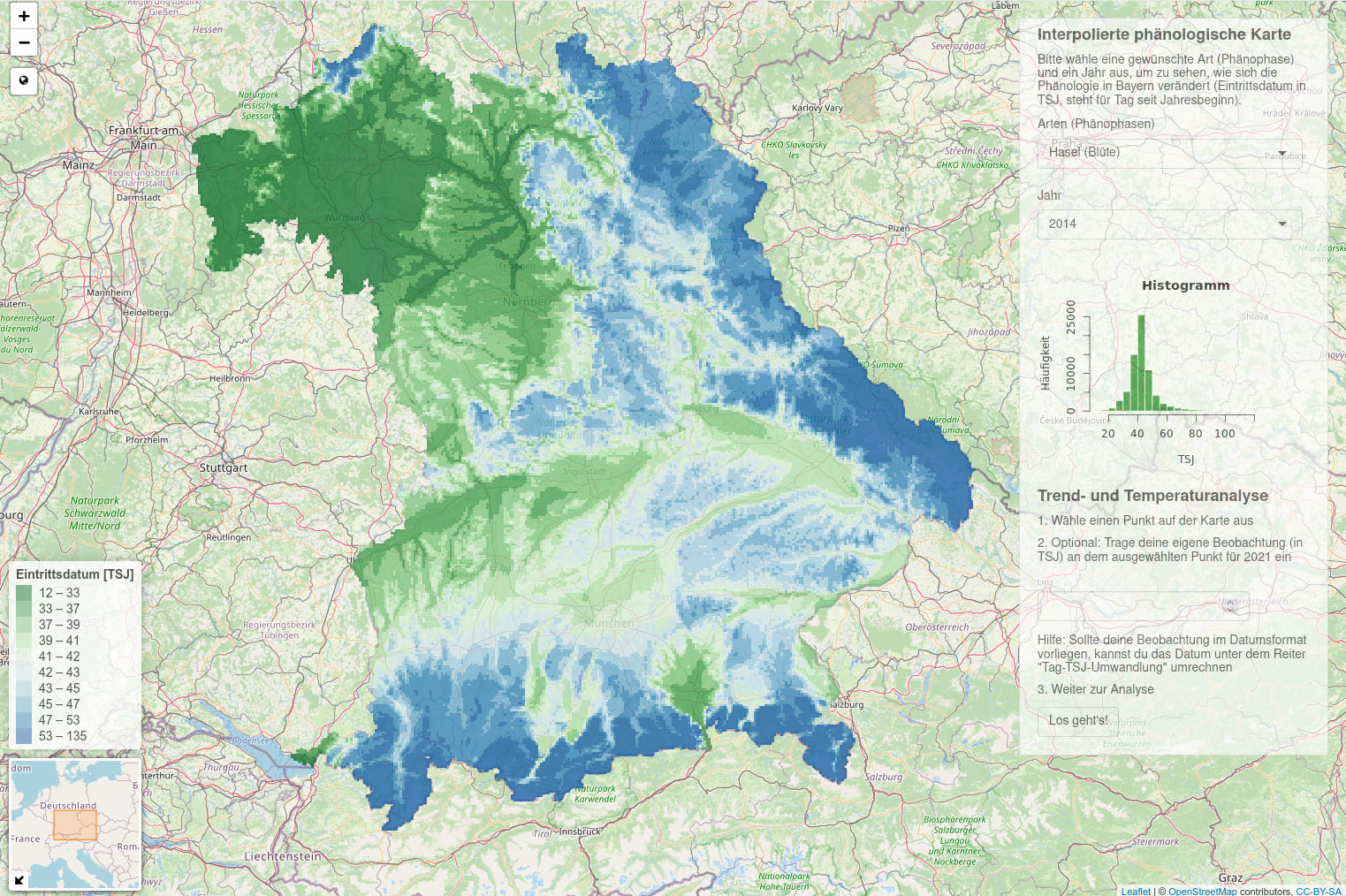 PhenoInterPol visualizes phenological interpolation maps in Bavaria. The phenophases of selected plants are stored for the period 1951-2020, e.g. the flowering of the hazel and the forsythia, the leaf unfolding and the leaf fall of the English oak.