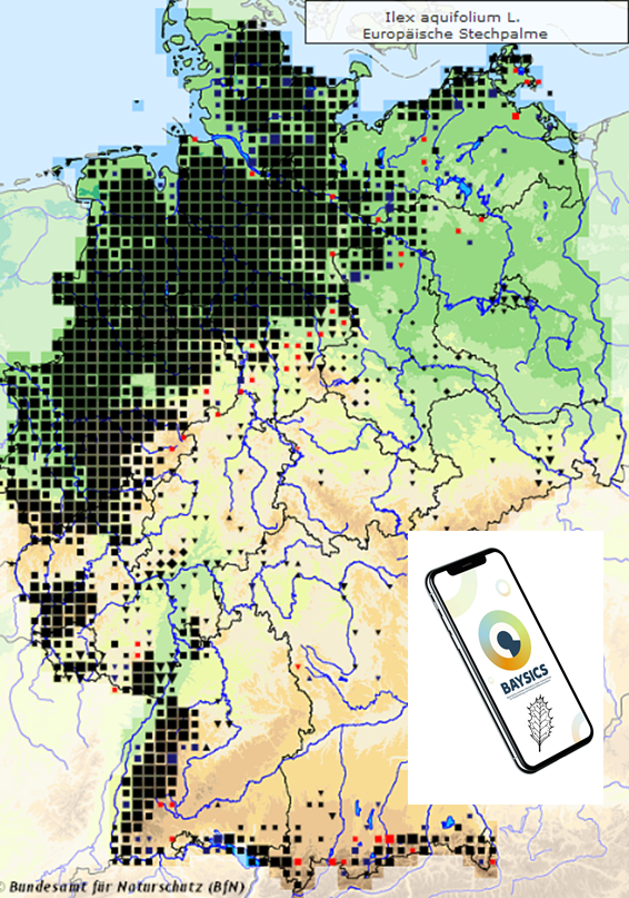 The common holly (“Tree of the Year 2021”), which is located mostly in Mediterranean and Atlantic regions, can be found in Bavaria on a small strip of land on the edge of the Alps. In the Alpine foothills, she reaches up to Lake Starnberg in the north; in the mountains, she grows from Lake Constance to the Berchtesgaden Alps in altitudes as high as 1.000 meter above sea level. That makes her interesting for BAYSICS: Is it possible, that the common holly “profits” from climate change by growing at higher altitudes nowadays? The forest botanist Prof. Jörg Ewald and his team at the University of Weihenstephan-Triesdorf are investigating the current spread of the common holly, in order to compare it to historical data from 1854. To do so, researchers require assistance from as many people and hikers as possible, who report the common holly when spotted in the wilderness of the Alpine foothills and the Bavarian Alps through the BAYSICS data portal (www.portal.baysics.de) or with the associated app – as far as the current pandemic allows. Because of her evergreen and prickly leaves, the common holly (Ilex aquifolium) can easily be spotted even in a winterly forest.