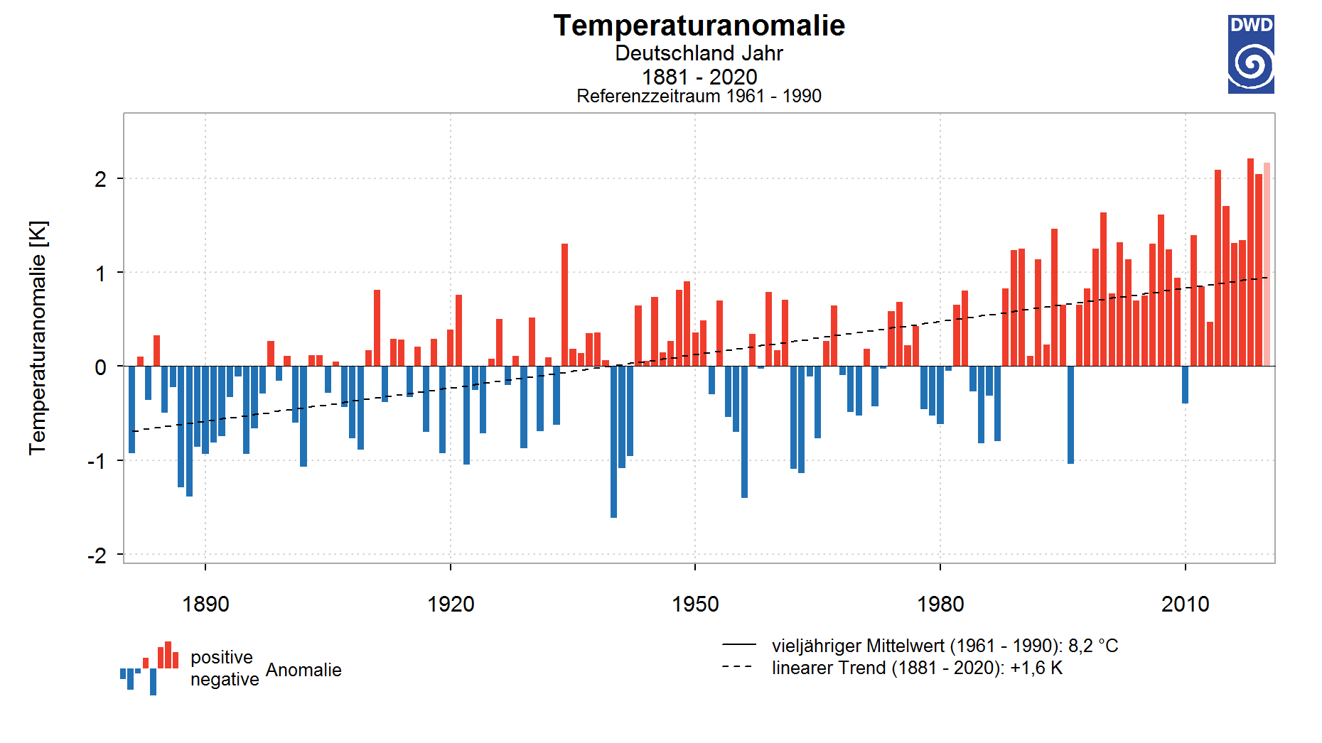 The German Weather Service (Deutscher Wetterdienst, DWD) has classified 2020 in his annual assessment as the second warmest year in Germany: The annual average temperature was 10.4 °C. Only in 2018, this number was slightly higher with 10.5 °C. Since weather recording began in 1881, 9 out of 10 of the warmest years were observed in the 21st century. The four warmest years were seen in the decade 2011-2020, thus being the warmest decade since weather records began.