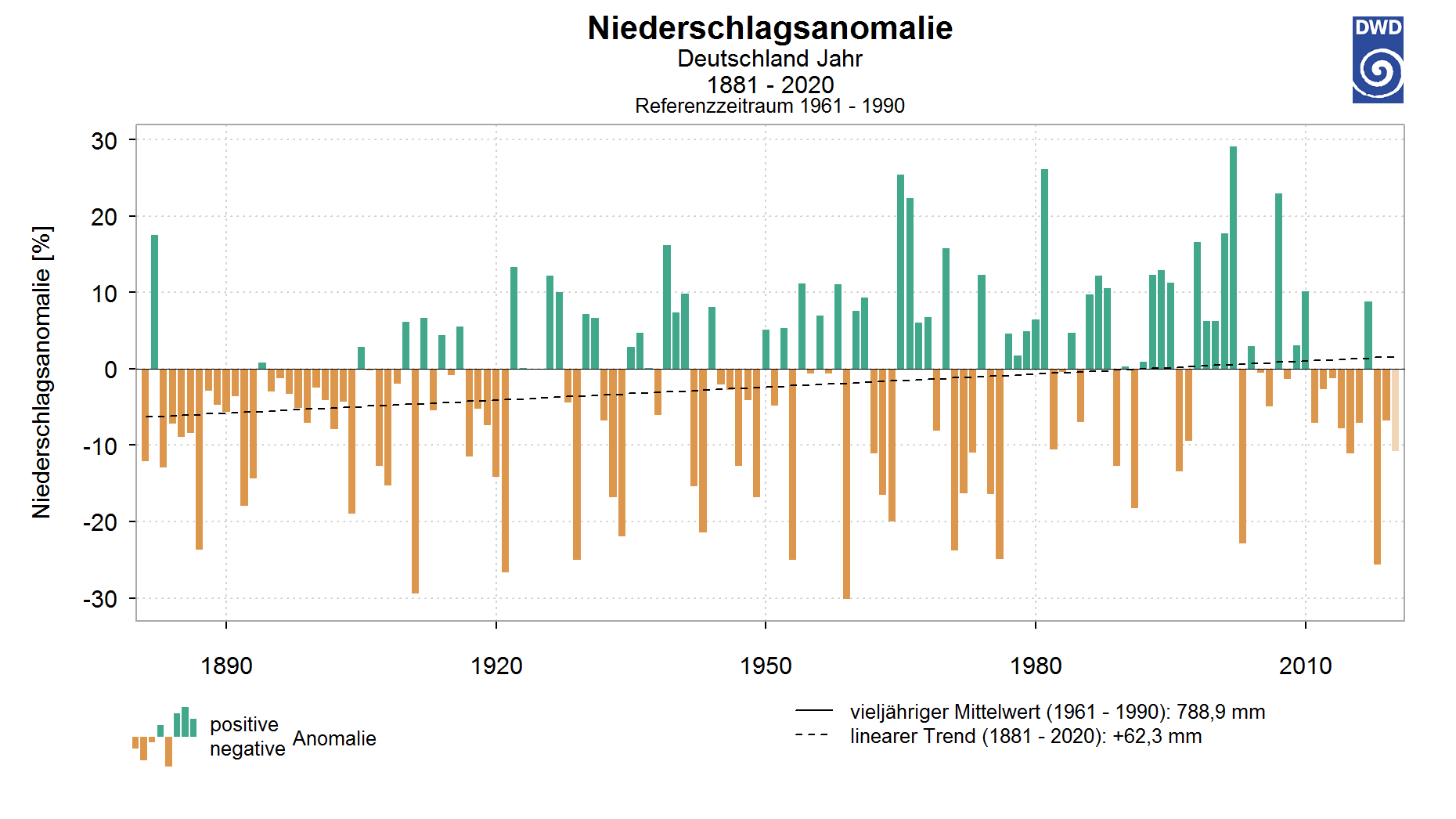 When comparing federal states, Bavaria was the coolest and second most humid state. Still, the annual average temperature was 9.5°C and therefore clearly higher than the long-standing average (1961-1990: 7.5°C) with a precipitation of 849 l/m2 falling short (1961-1990: 941 l/m2). Drought and exceptionally high precipitation often occurred close together: There were local floods due to heavy rain storms in June (Hammersbach in the district of Garmisch Partenkirchen) and continuous rain falls at the beginning and end of August (Southern Bavaria). German Weather Service – press release