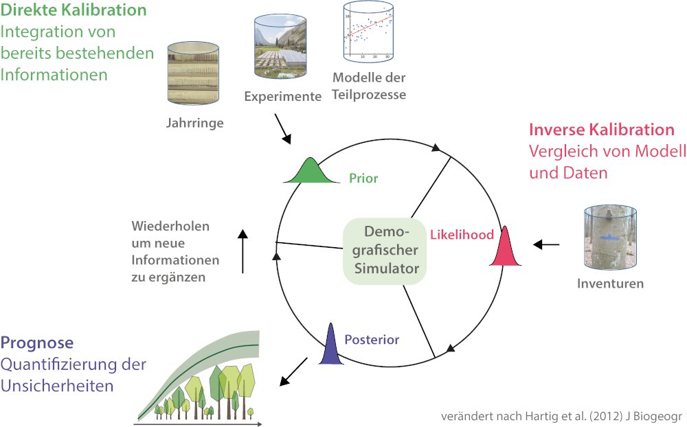 This is where the project BayForDemo comes in: For the projection of forest development, an empirically parameterized simulation environment is developed that describes tree growth, mortality and regeneration in response to climate and biotic interactions. For calibrating this demographic simulator, information from a large variety of forest data sources is combined using Bayesian methods. By this means, also processes that are only poorly informed by observations, e.g. regeneration, can be calibrated. This approach allows for an improved understanding of the demographic diversity of European tree species, the intraspecific variability and the effects of environmental drivers.
